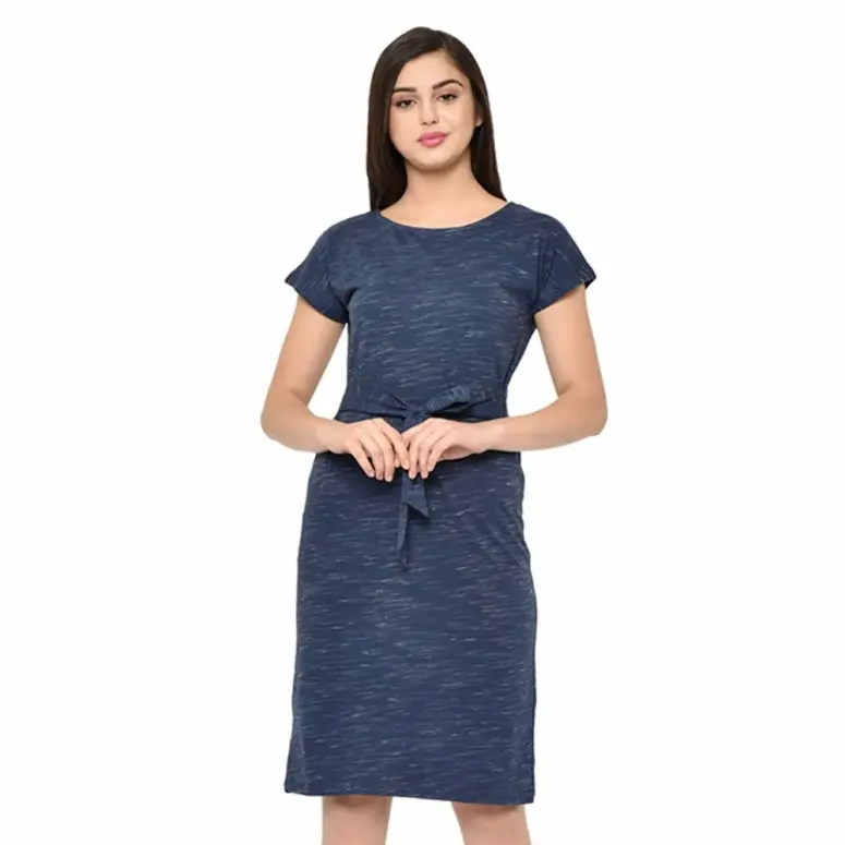 RIGO Blue Cotton Knited Self Textured Half Sleeves Knee Length Dress for Women (Medium)